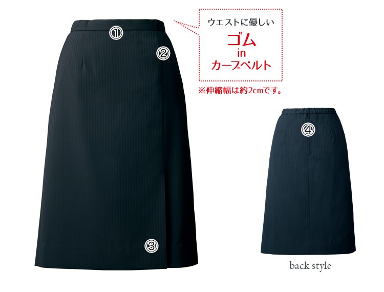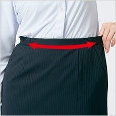 誰でも着こなしやすく足さばきの良いAラインスカート。ウエストは動きに優しくアジャストするゴム入りで、ストレスを軽減。左サイドに片プリーツ入り。