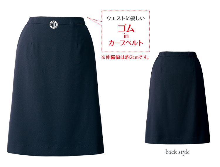 裾が広がりすぎないAラインスカート。ウエストは窮屈さがなく、動きにアジャストするゴムinカーブベルト仕様です。