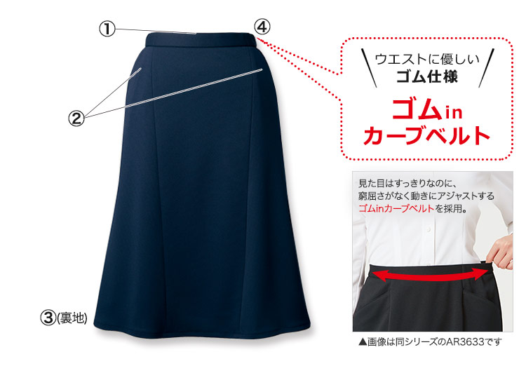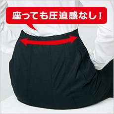 脇から後ろが絶妙な伸縮性を発揮し、座った時もウエストが伸びるからノーストレス!※画像は同素材の別のスカートです。
