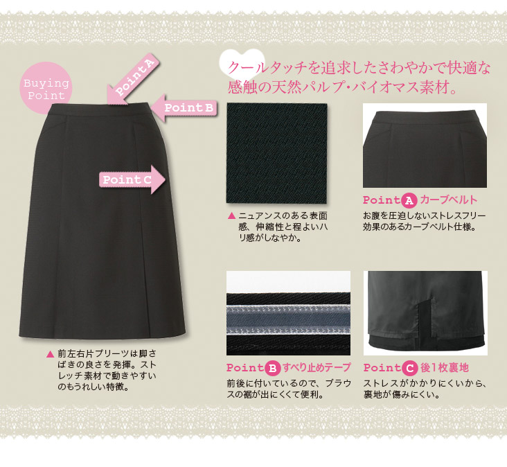 - カーブベルト、ストレッチ裏地、後1枚裏地、スライドカン、すべり止めテープ、ポケット左右、前左右片プリーツ