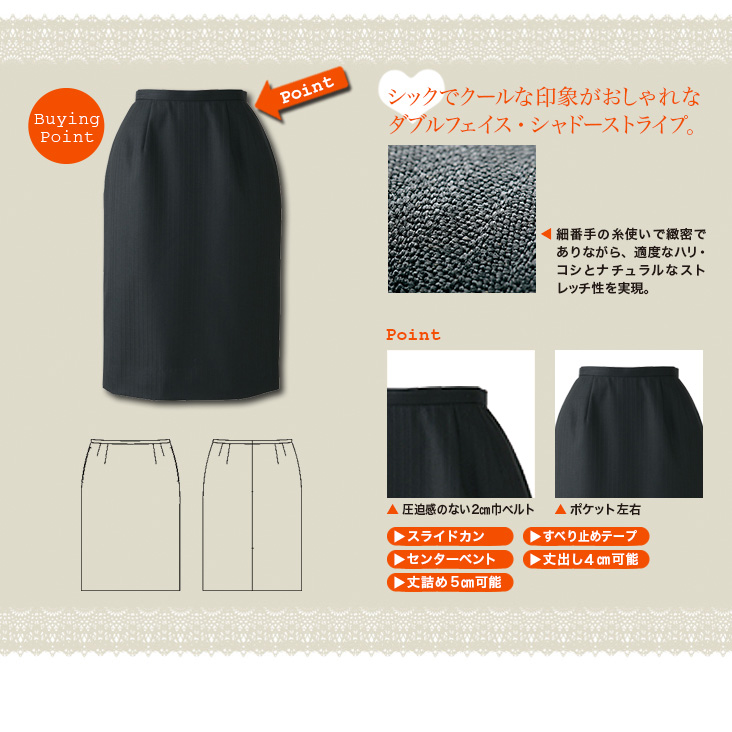 | スカート丈(ベルト下) | 52 | 52 | 53 | 53 | 54 | 54 | 55 | 55 | 56 | 56 |