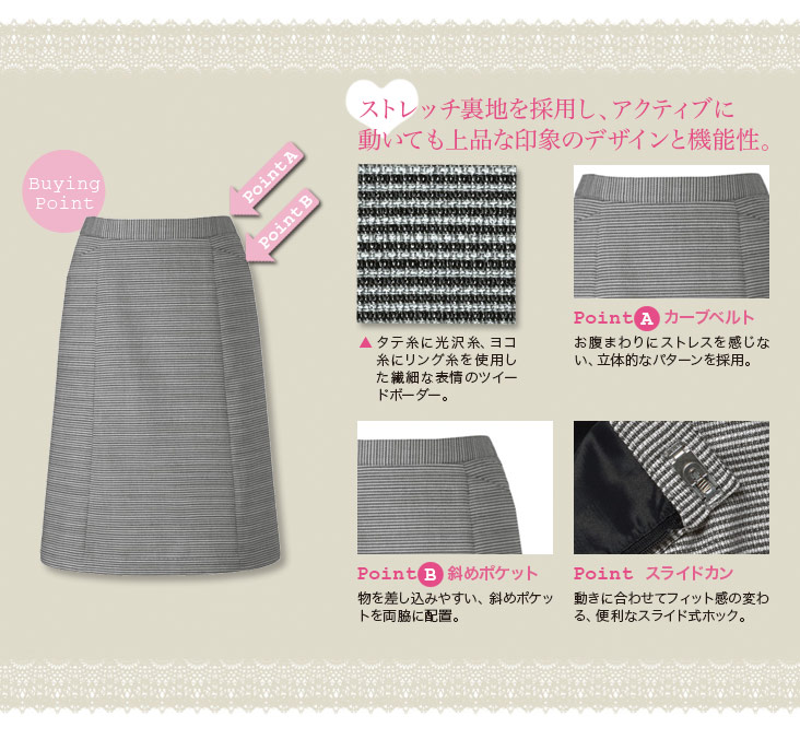 ツイードボーダーのAラインスカートは、上品な雰囲気を演出しアクティブな動きもエレガントに見せてくれます。