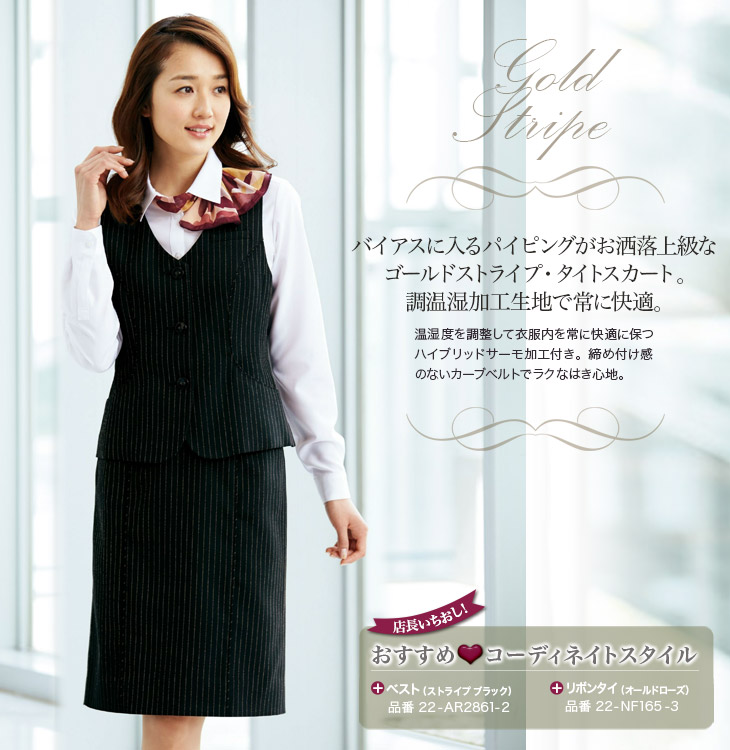 【在庫限り】[通年]<調温湿加工生地>パイピングがお洒落なゴールドストライプ・タイトスカート(22-AR3861)