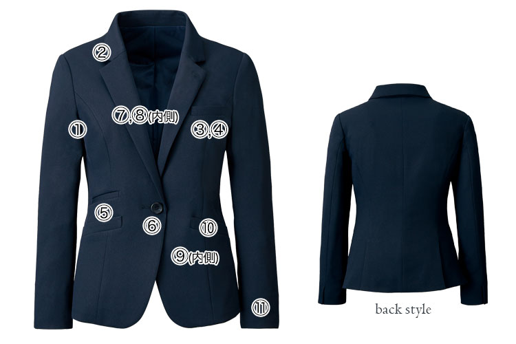 - 総裏、軽量肩パッド、フラワーホール、左胸タフポケット、ペンホルダー、左右内ポケット、ブローチ用タブ、インカムループ、スマホルダーⅡ、ホルダーテープ(左のみ)、フレックスリーブⅡ、デオドラントテープ、制電テープ、袖口ベント、サイドベンツ