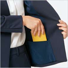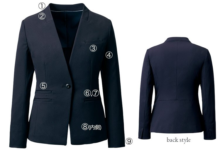 - 背抜き、抗菌防臭ストレッチ裏地、軽量肩パッド、左胸タフポケット、ペンホルダー、左右内ポケット、ホルダーテープ(左のみ)、アクセサリー用ホール、スマホルダーⅡ、フレックスリーブⅡ、デオドラントテープ、制電テープ、袖口ベント、グリーン購入法適合
