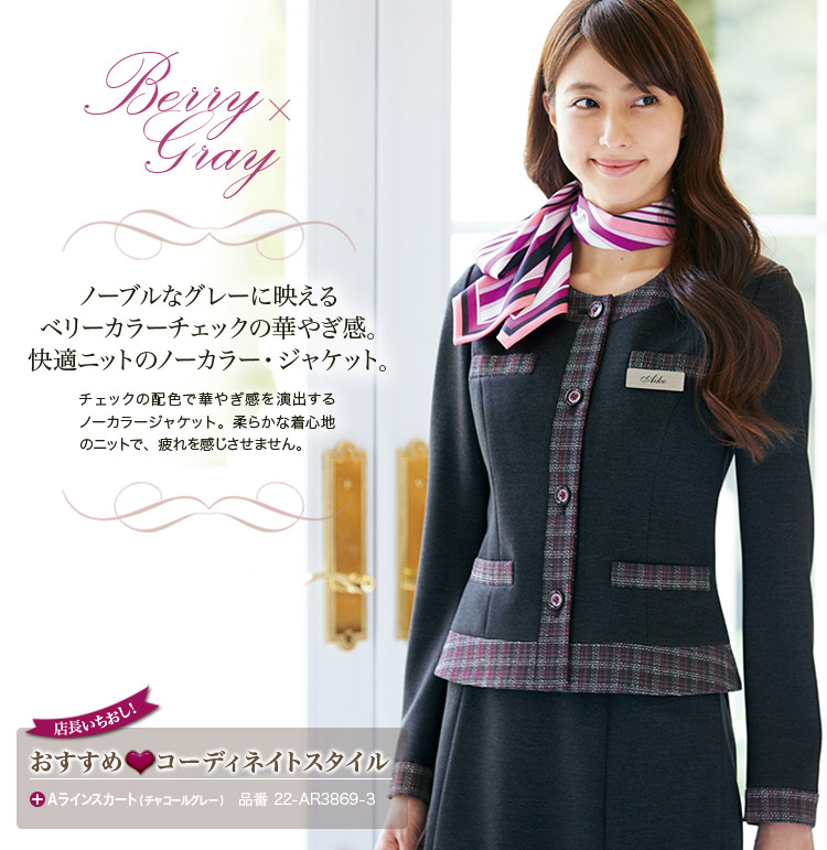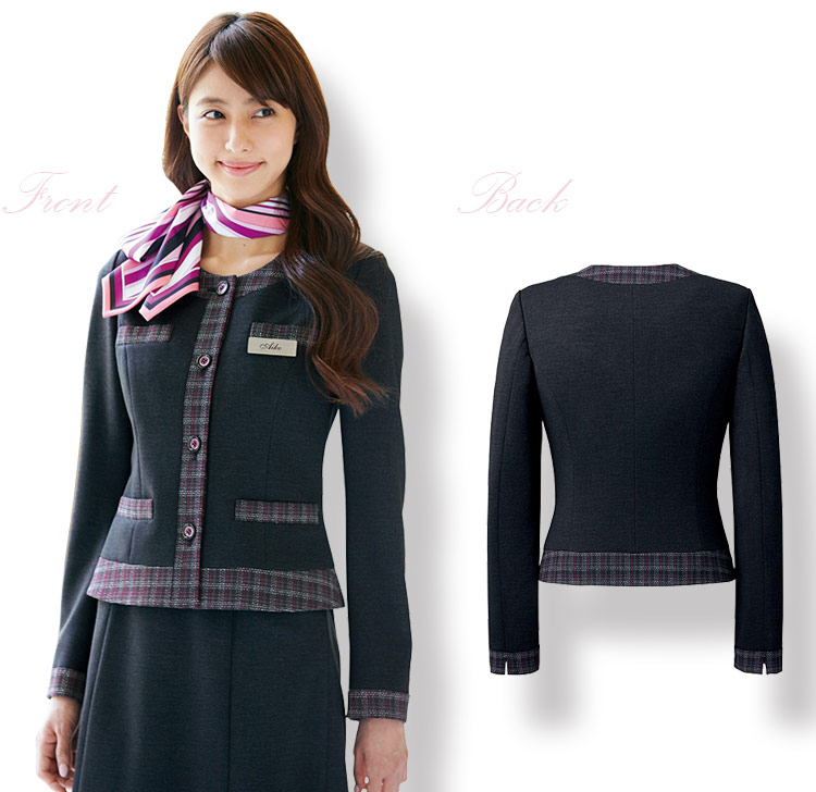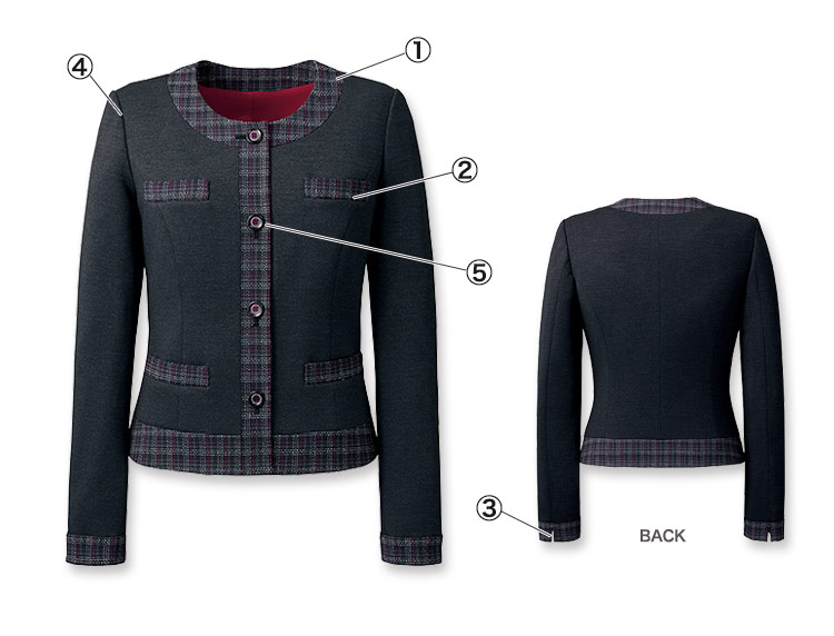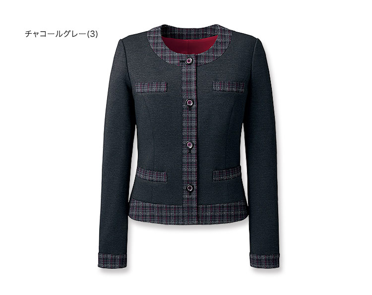 【在庫限り】[通年]ベリーカラーチェックが華やかなニット素材ノーカラー・ジャケット(22-AR4867)