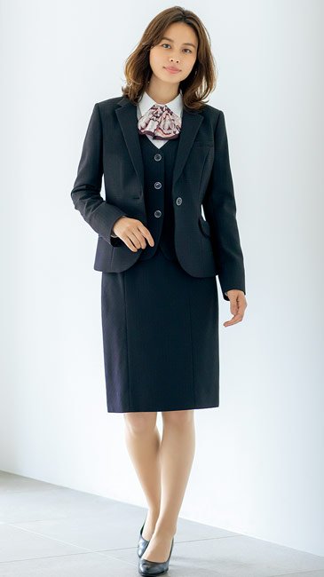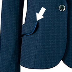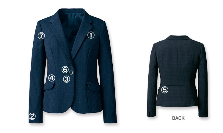 - 総裏、帯電防止ストレッチ裏地、左胸ポケット、左右内ポケット、名札ホール、フレックスリーブⅡ、袖口ベント、ブローチ用タブ