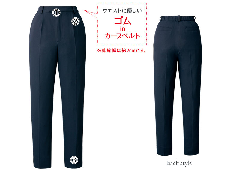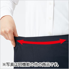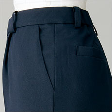 - ゴムinカーブベルト、ジャストウエスト、帯電防止トリコット裏地、裏付きひざ下丈、ベルトループ、制電テープ、ポケット左右、ポケット後左右