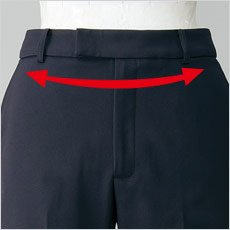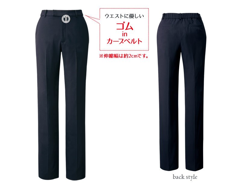 - ゴムinカーブベルト、ジャストウエスト、帯電防止ストレッチ裏地、前裏付きひざ下丈、ベルトループ、制電テープ、ポケット左右、ポケット後左右、グリーン購入法適合