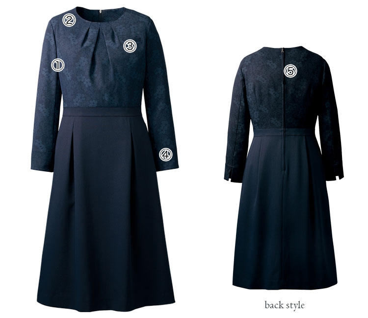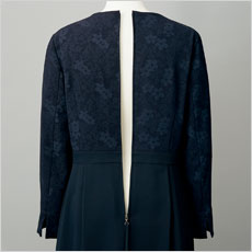 - 総裏、袖裏なし、帯電防止トリコット裏地、左胸タフポケット、アクセサリー用ホール、フレックスリーブⅡ、デオドラントテープ、制電テープ、九分袖口スリット、左右ポケット