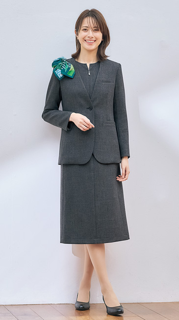おもてなしシーンに映える美シルエットの前ファスナーワンピース。程よいトレンド感のゆとりを持たせたデザインで誰でも着こなしやすい。