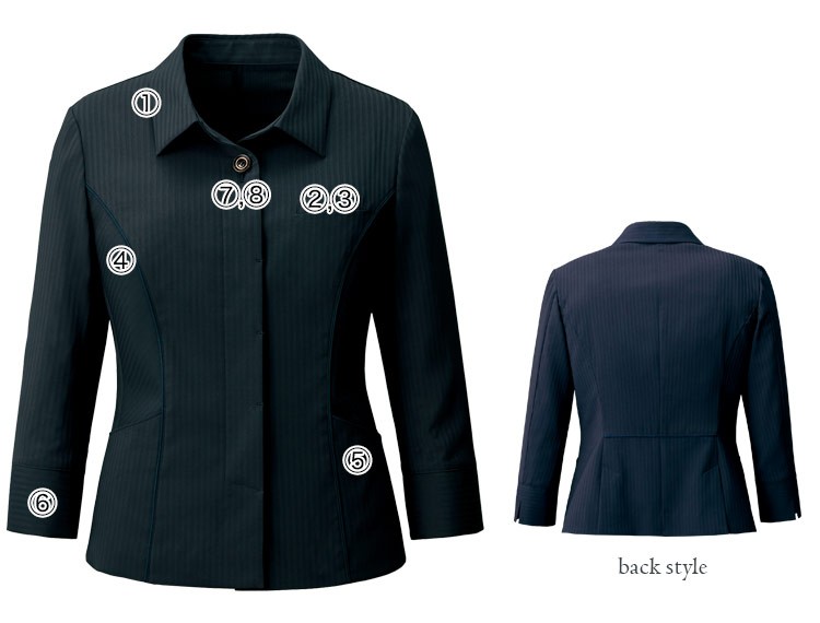 - 前裏付き、左胸タフポケット、ペンホルダー、ブローチ用タブ、ホルダーテープ(左のみ)、フレックスリーブⅡ、デオドラントテープ、袖口ベント、サイドベンツ