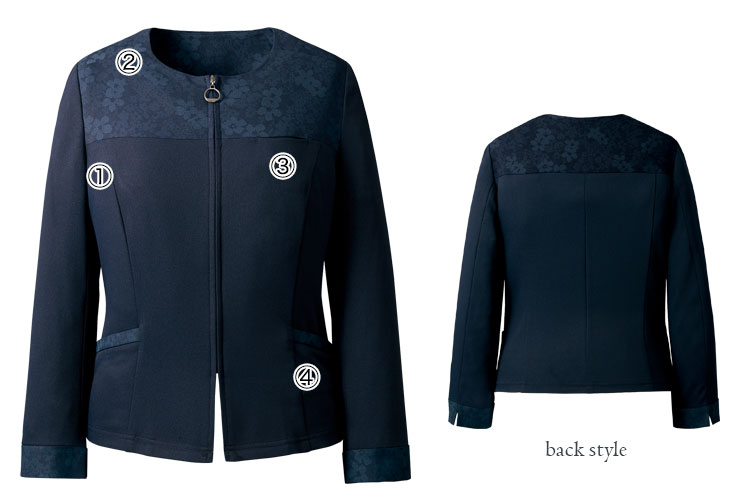 - 一重仕立て、ペンホルダー、アクセサリー用ホール、ホルダーテープ(左のみ)、フレックスリーブⅡ、デオドラントテープ、制電テープ、九分袖スリット