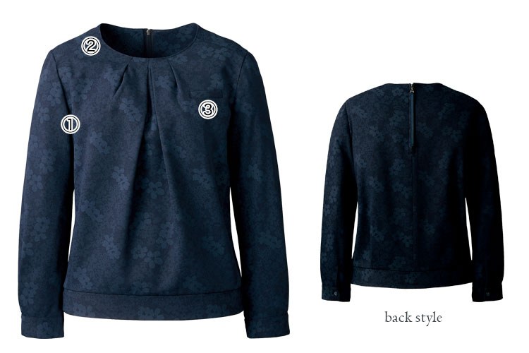 - 一重仕立て、左胸タフポケット、アクセサリー用ホール、フレックスリーブⅡ、デオドラントテープ、制電テープ、九分袖口カフス