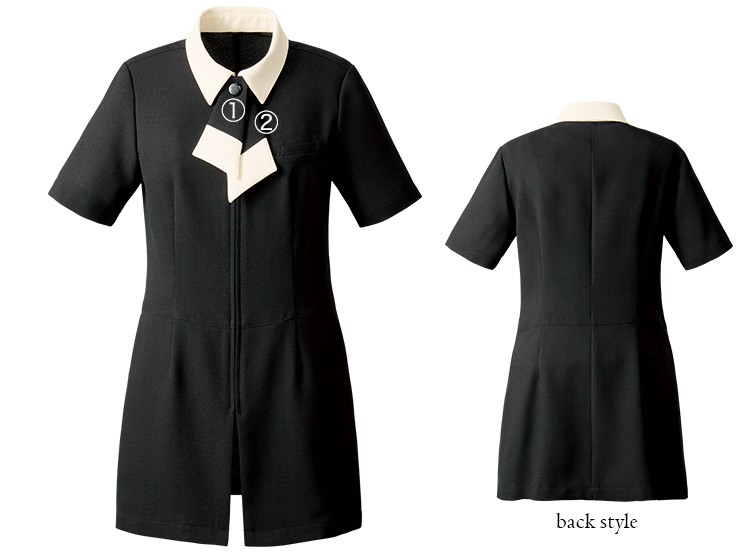 - 一重仕立て、左胸ポケット、ファスナー前中心開き、ポケット左右、デオドラントテープ、リボンタイ取り外し可能