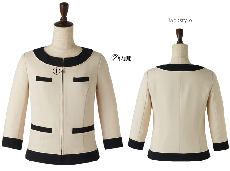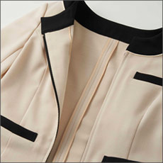 相性のよい黒×ベージュで魅せるMARY QUANTのノーカラージャケット。軽やかさの中にも程よいフォーマリティを感じさせる、好感度の高いおもてなしスタイル。季節を問わず着用していただけます。