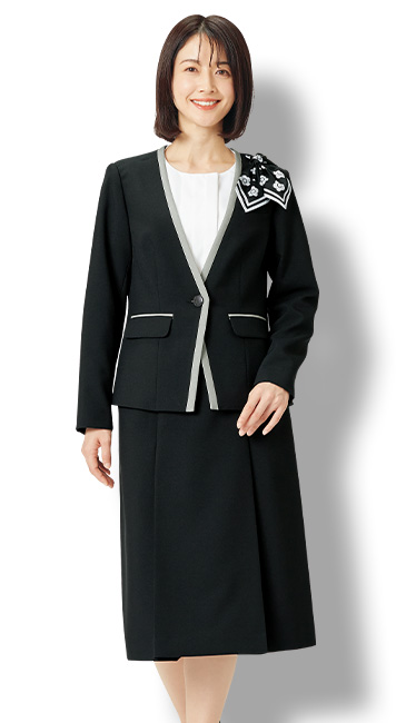 マリークワントの、モノクロームが美しいシックな雰囲気を纏うライトジャケット。首周りをすっきりと魅せるノーカラー仕様。全方向にストレッチ性を持った動きやすく軽快な素材で、動きの多いお仕事もしっかりサポートします。同じシリーズの商品の中でコーディネートを組むことで、階級や職種で組み合わせを変えても統一感が生まれるのでおすすめです。