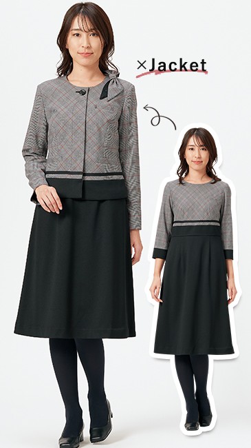 - 身頃部分:グレナカートチェック(ポリエステル45%、ウール40%、複合繊維(ポリエステル)15% ※再生ポリエステル43%使用)、スカート部分:コンフォータブルニット(ポリエステル100%)