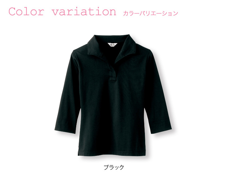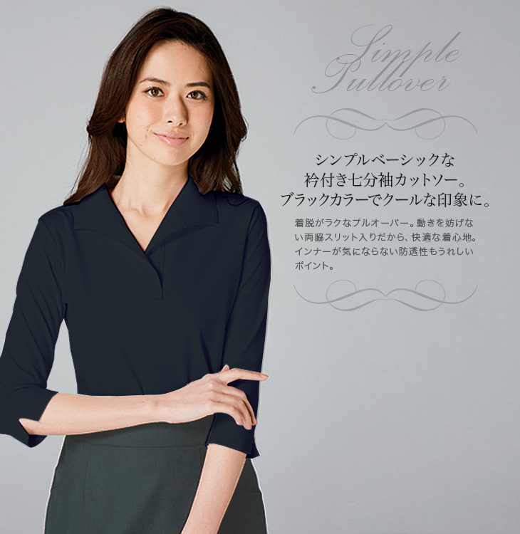 【在庫限り】[通年]女性らしくキレイな印象になる衿付き七分袖カットソー<ブラック>(22-NF1025-2)