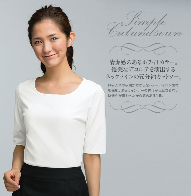 【在庫限り】[通年]優美なネックラインの五分袖カットソー<ホワイト>(22-NF15120R)