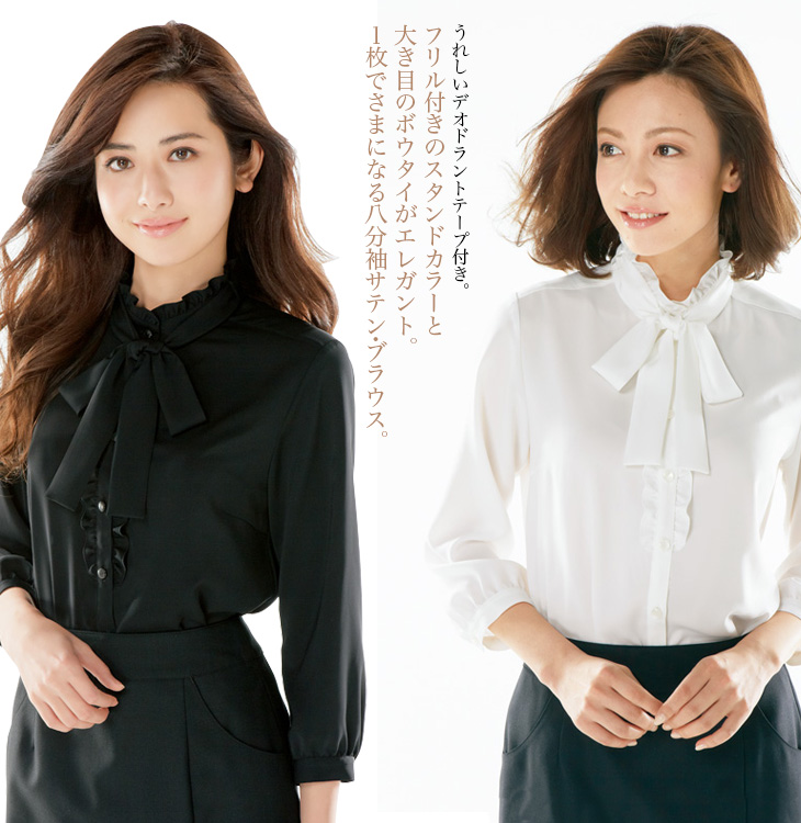 【在庫限り】[通年]<サテン生地>上品なボウタイ付き・八分袖ブラウス(22-NF1532)
