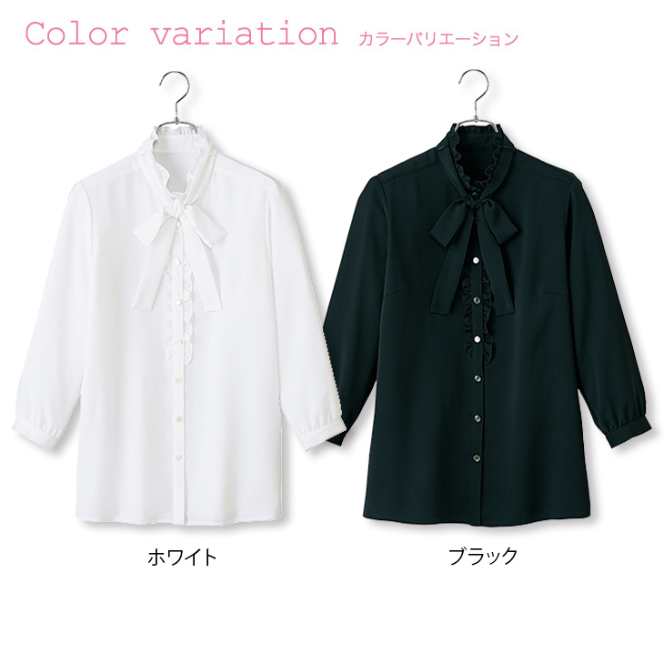 【在庫限り】[通年]<サテン生地>上品なボウタイ付き・八分袖ブラウス(22-NF1532)
