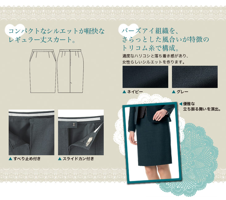 5年程前に同じデザインの丈長めの57センチ丈の7号を購入。他の制服に比べ5年間洗濯しても全くシワにならず生地のヘタレもないためとても気に入っていました。153センチの細見体系でシルエットもピッタリだったのですが食事後にウエストが苦しいため今回は9号の52センチ丈のこちらを購入しました。ウエスト食事後も快適です。私の身長で丁度ヒザ上になってバランスも良いです。少し7号よりヒップラインが余るかな・・。こちらのお直しができると良いなあ。あと欲を言えばチャックと止め具が左横にあったら最高です。運転時などシートにもたれると止め金具が背骨に当たって少し痛い・・。これが無ければコスパも最高の商品だと思います。