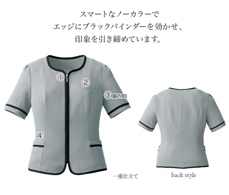 - 一重仕立て、前ファスナー仕様、デオドラントテープ、左胸ポケット、左右ポケット