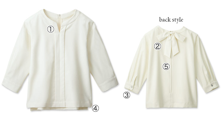 - 一重仕立て、七分袖口カフス、デオドラントテープ、両脇スリット、ファスナー後中心あき、リボンブローチ付き