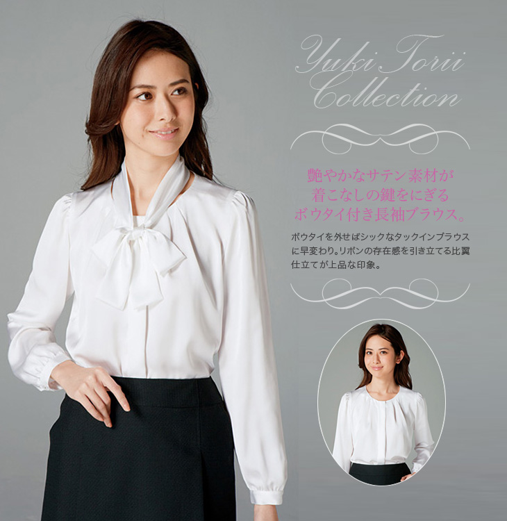 【在庫限り】[通年]<サテン生地>YUKI TORII ボウタイ付きタック入り長袖ブラウス(22-YT1900)