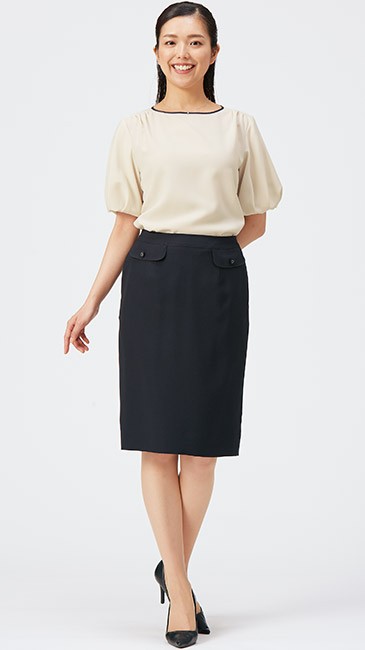 程よくコンパクトなシルエットのタイトスカートは、トップスをインしても華やかなフラップ付き。汗ジミ・汚れを防ぐ撥水加工付きでシワになりにくいのが嬉しいストレッチ素材。