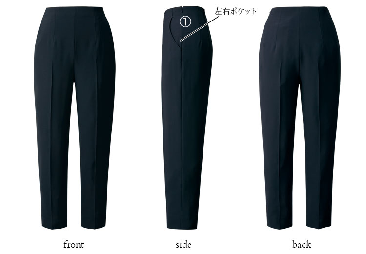 センタープレスのテーパードパンツ。締めつけ感のないハイウエスト、左脇あきで、おなか周りをすっきり見せます。