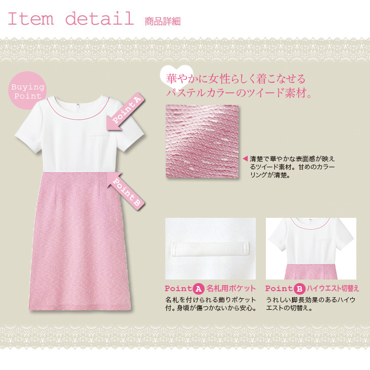 - 上身頃部分(ポリエステル100%),スカート部分(スイートファインツイード:ポリエステル52%,毛27%,アクリル15%,ナイロン6%)