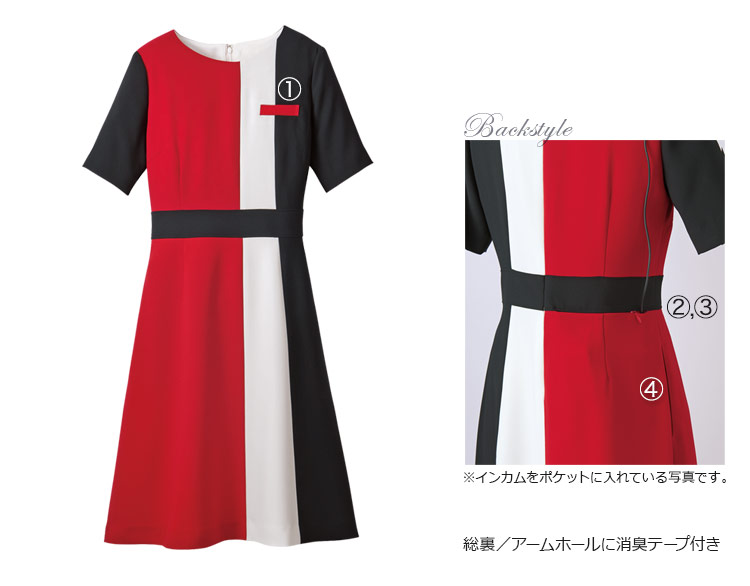 3色が引き立つモダンな配色と大胆に切り替えたデザインが、おもてなしシーンに鮮やかな印象を残す、TRICOLORワンピース