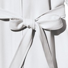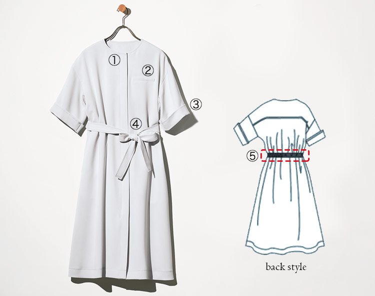 程よくゆったりとしながらウエストリボンでフェミニンに着こなす、ナチュラルカラーのワンピース。制菌機能付きで、接客中も安心感がもてます。