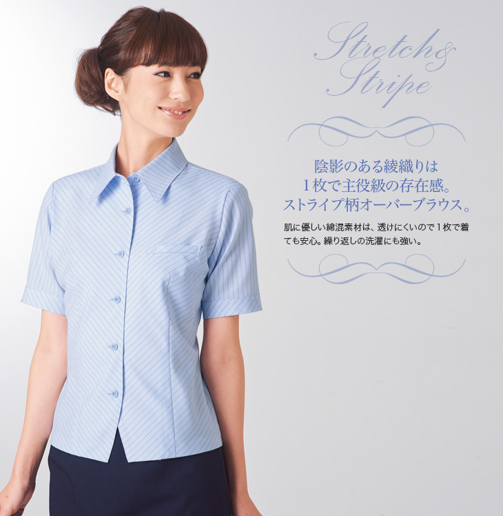 【在庫限り】[春夏用]<抗菌・防臭>清潔感のある繊細なストライプ柄オーバーブラウス(23-8330)