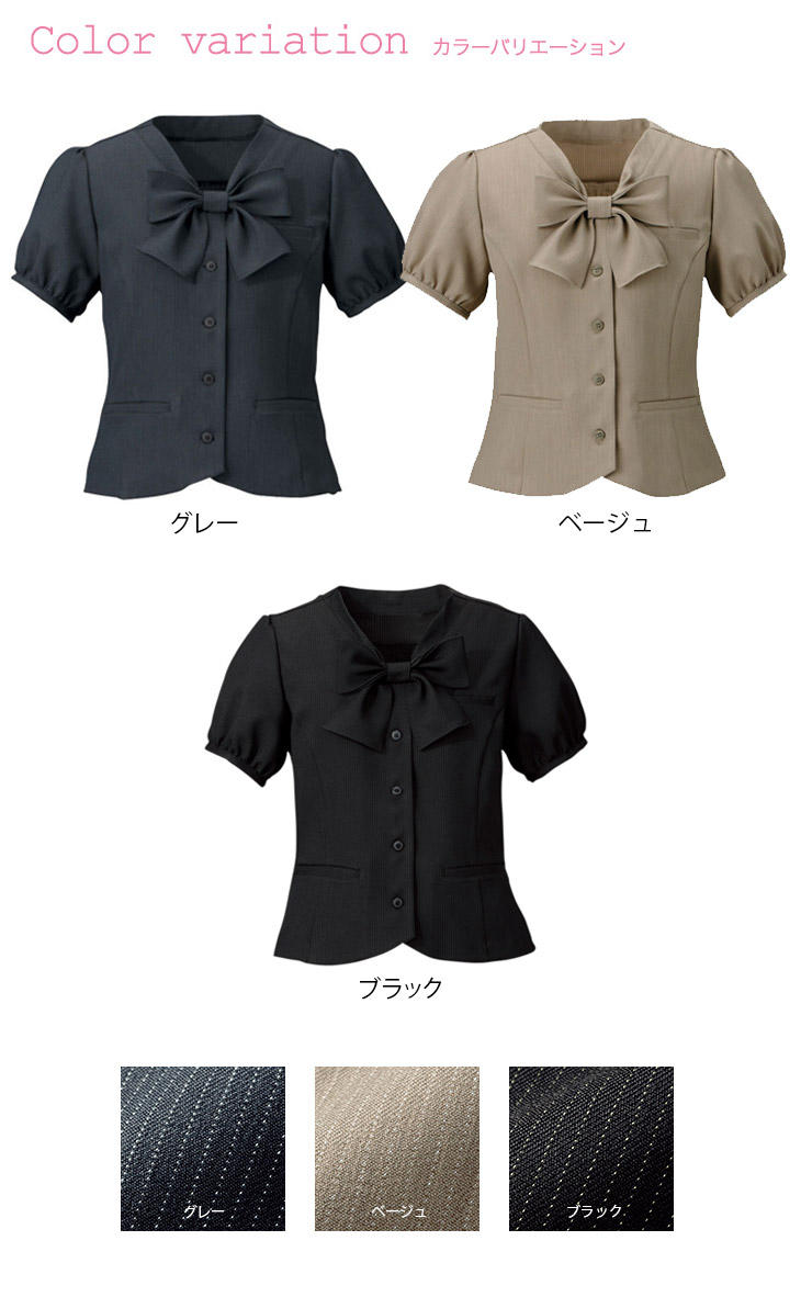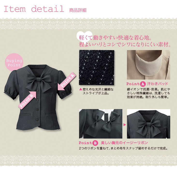 【在庫限り】[春夏用]<抗菌・防臭>胸元の大きなリボンが印象的・ストライプ柄オーバーブラウス(23-8345)