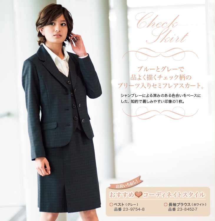 【在庫限り】[通年]ブルー×グレーの繊細なチェック柄・プリーツ入りセミフレアスカート(23-8997)