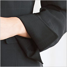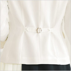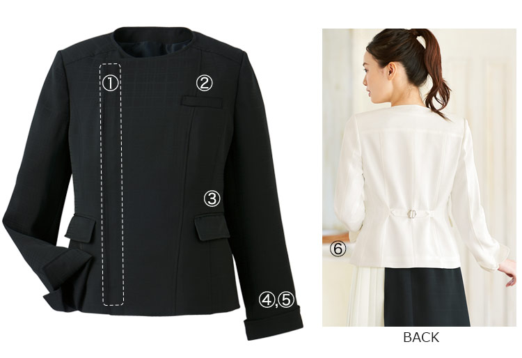 ビューティーシーンに美しい存在感を放つ、白と黒のモノトーンジャケット。すっきりしたデザインが女性らしさを際立たせます。汚れに強い、防汚加工付きで白でも安心です。