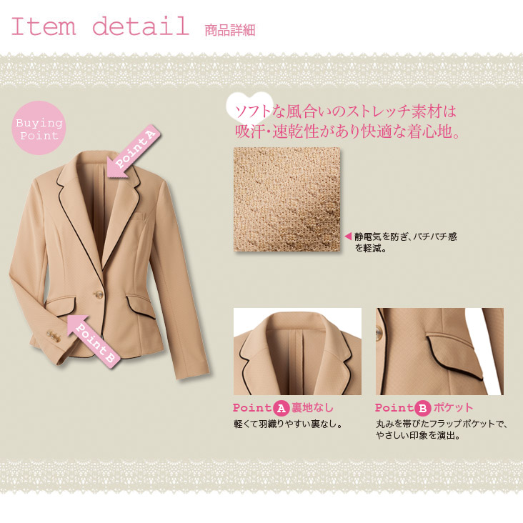 どれも同じように見えがちなジャケットと比べて、ベージュのパイピングが効いていておしゃれなところがお気に入りです!