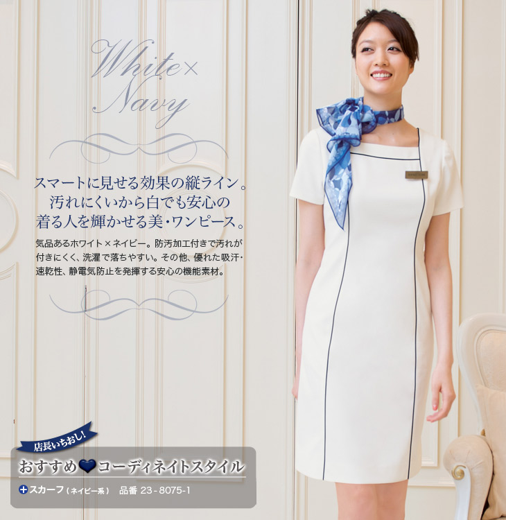[通年]<ホワイト×ネイビー>縦ラインでスマートに見せる白いワンピース(23-WP769)