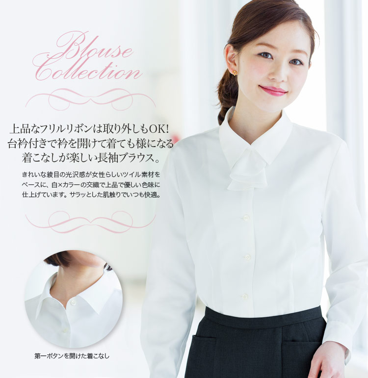 上品なフリルボタンは取り外しOK!台襟付きの長袖ブラウス