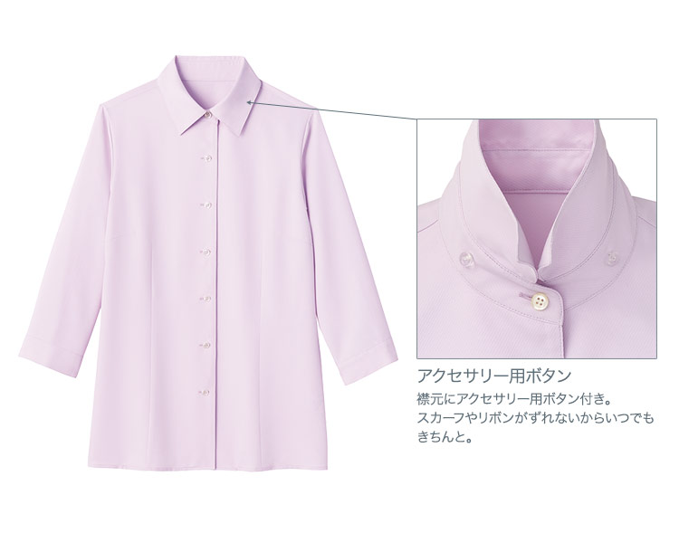 襟元にアクセサリー用のボタンが付いた、吸汗速乾で着心地の良い七分袖ブラウス。