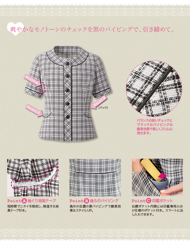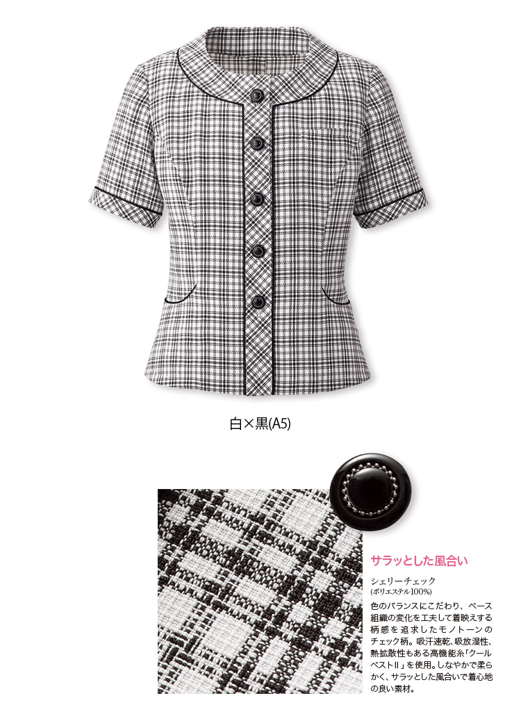 【在庫限り】[春夏用]ノーカラー・モノトーンチェックのオーバーブラウス(28-GOBL1404)