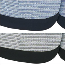 ブルーは濃紺、グレーは黒で縁取った裾がボトムスとの境をカモフラージュ。