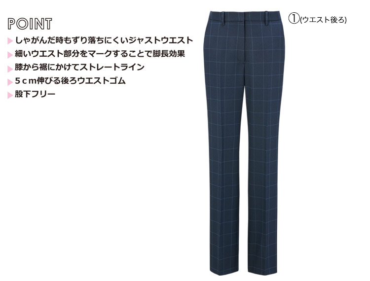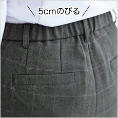 グレーにはローズピンク系、ネイビーにはサックスブルー系を差し色にしたウィンドーペン柄のパンツ。ストレッチ性と後ろゴムで快適な着心地です。