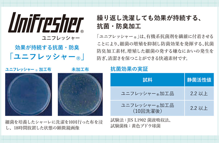 抗菌防臭加工「ユニフレッシャー®」を施した安心素材。