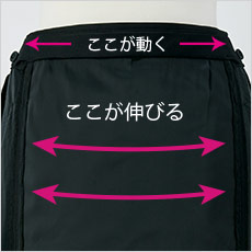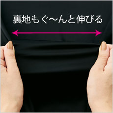 信州大学との共同研究により開発。可動式ウエストと下腹部のストレッチ裏地で、ウエストまわりだけでなく下腹部までぐ~んと伸びるて快適。