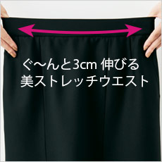 可動式のウエストと下腹部のストレッチ裏地で、ウエストまわりだけではなく下腹部までぐーんと伸びるので、座った時のお腹まわりの窮屈感を軽減してくれます。