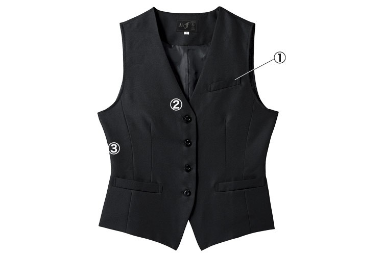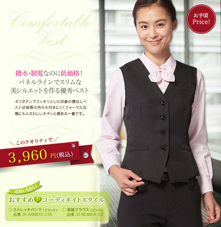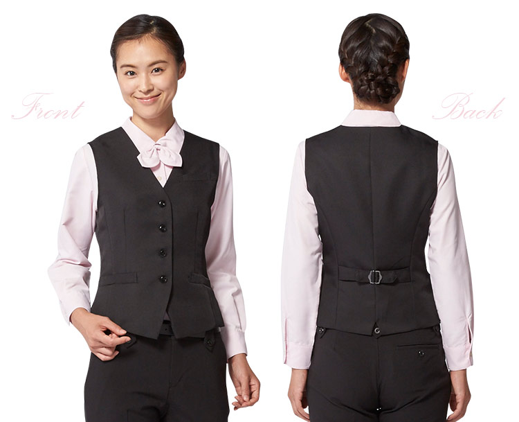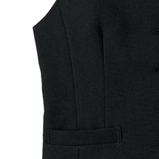 撥水・制電加工のあるノーカラーのベストです。汚れても簡単に落とせるため、日々のお手入れも簡単!制電加工は衣服のまとわりつきだけでなく、ほこりなどの吸着も防ぐため、清潔感を保てます。